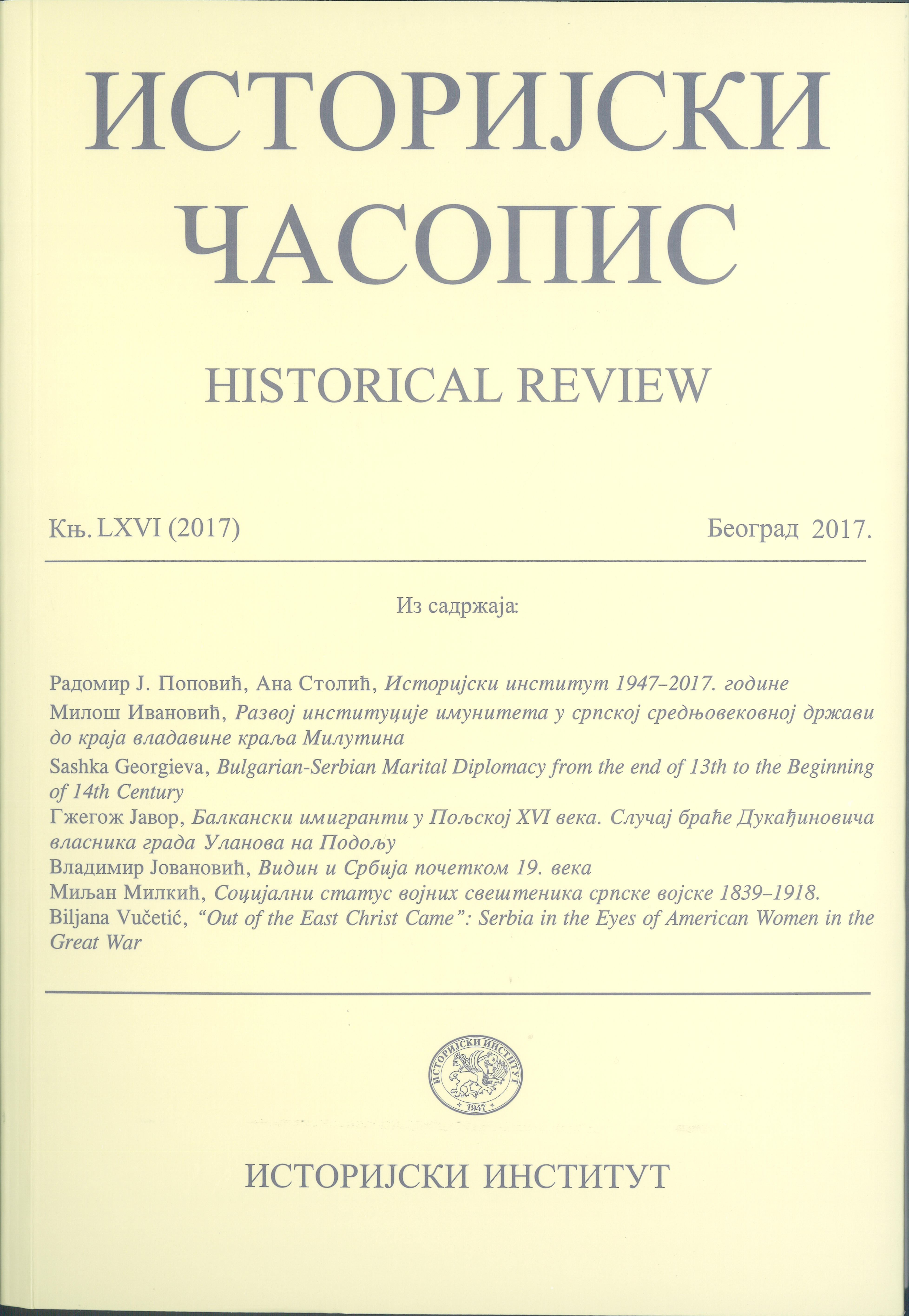 Miljan Milkić, “Social Status of Serbian Military Chaplains, 1839-1918”, The Historical Review, vol. LXVI (2017), pp. 321-340.